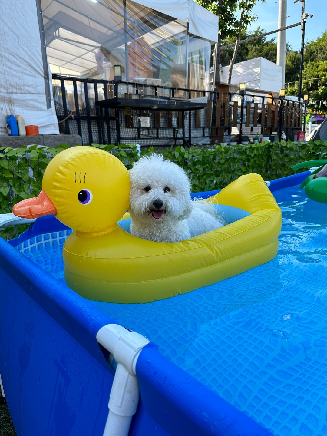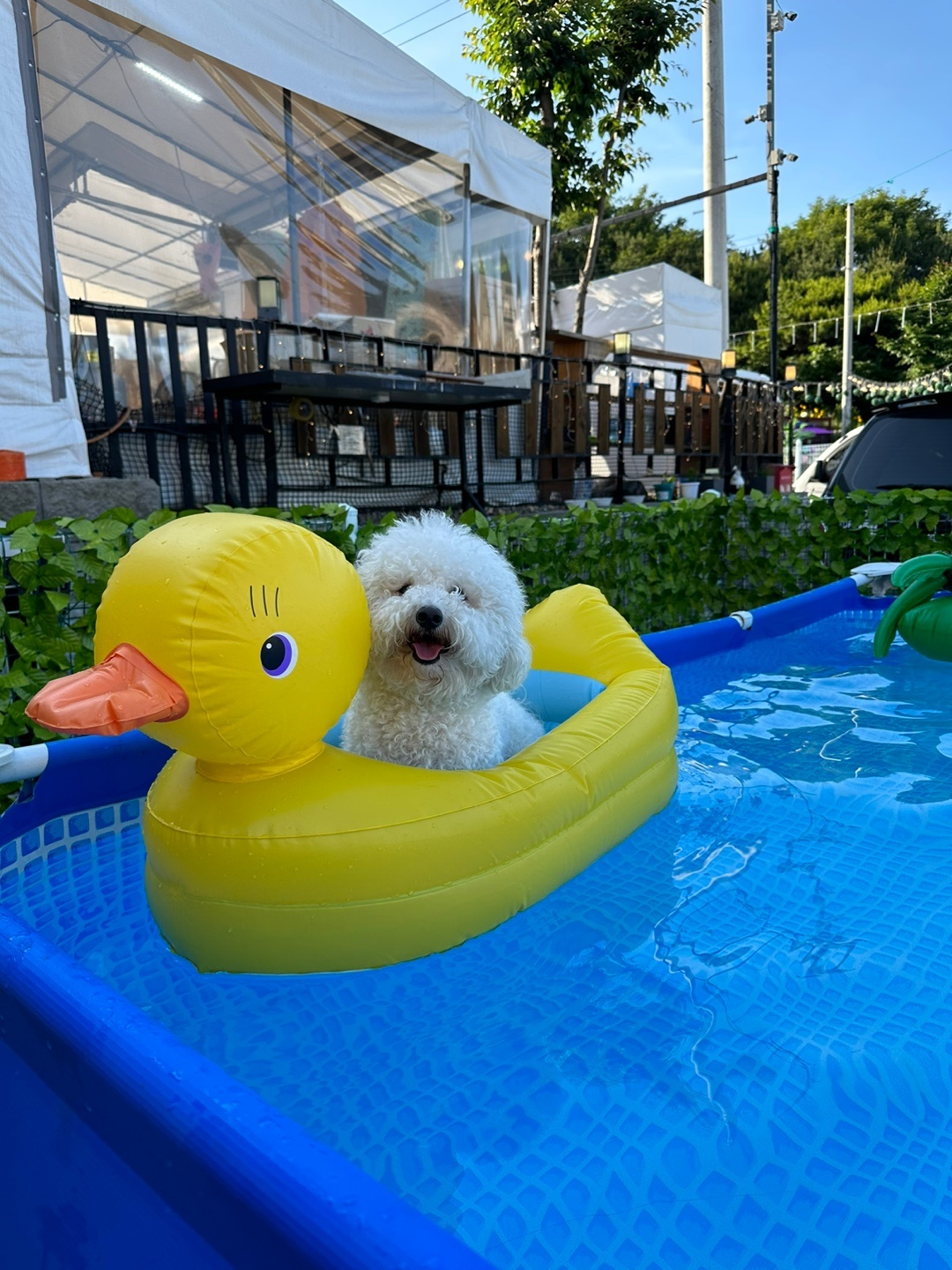 강아지와 같이 들어가서 놀 수는 없지만 나름 재밌게 놀 수 있었습니다. 견주를 위한 풀장엔 큰 미끄럼틀도 있어 상당히 재밌게 놀았습니다.