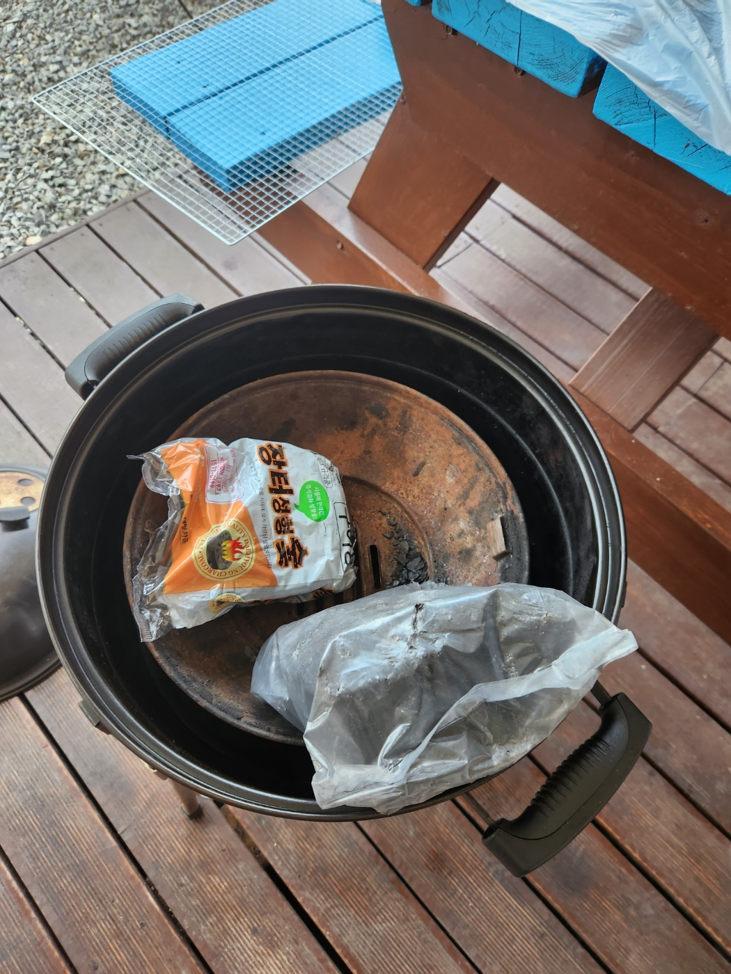 물놀이 후 바비큐를 구워 먹었는데 사장님께서 숯과 번개탄을 넣어두고 가시면 저희가 불을 붙여서 구워 먹습니다.
