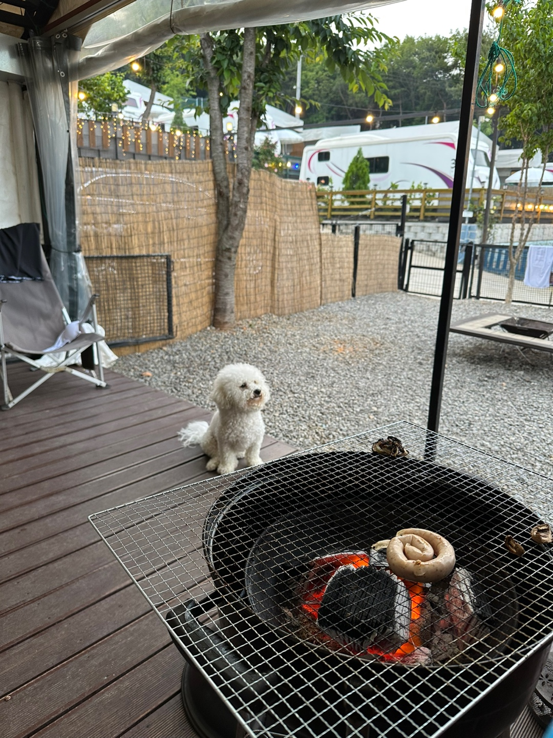 좋은 점이 펜스가 있어 바비큐를 굽는 동안 강아지를 맘껏 풀어놓을 수 있습니다. 굽다가 하나씩 줘가며 (소금 안 뿌린 고기) 저도 한점 강아지도 한점 먹으니 기분이 정말 좋았습니다.